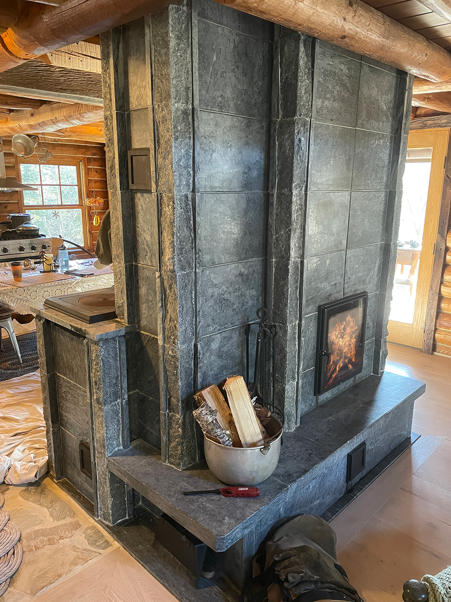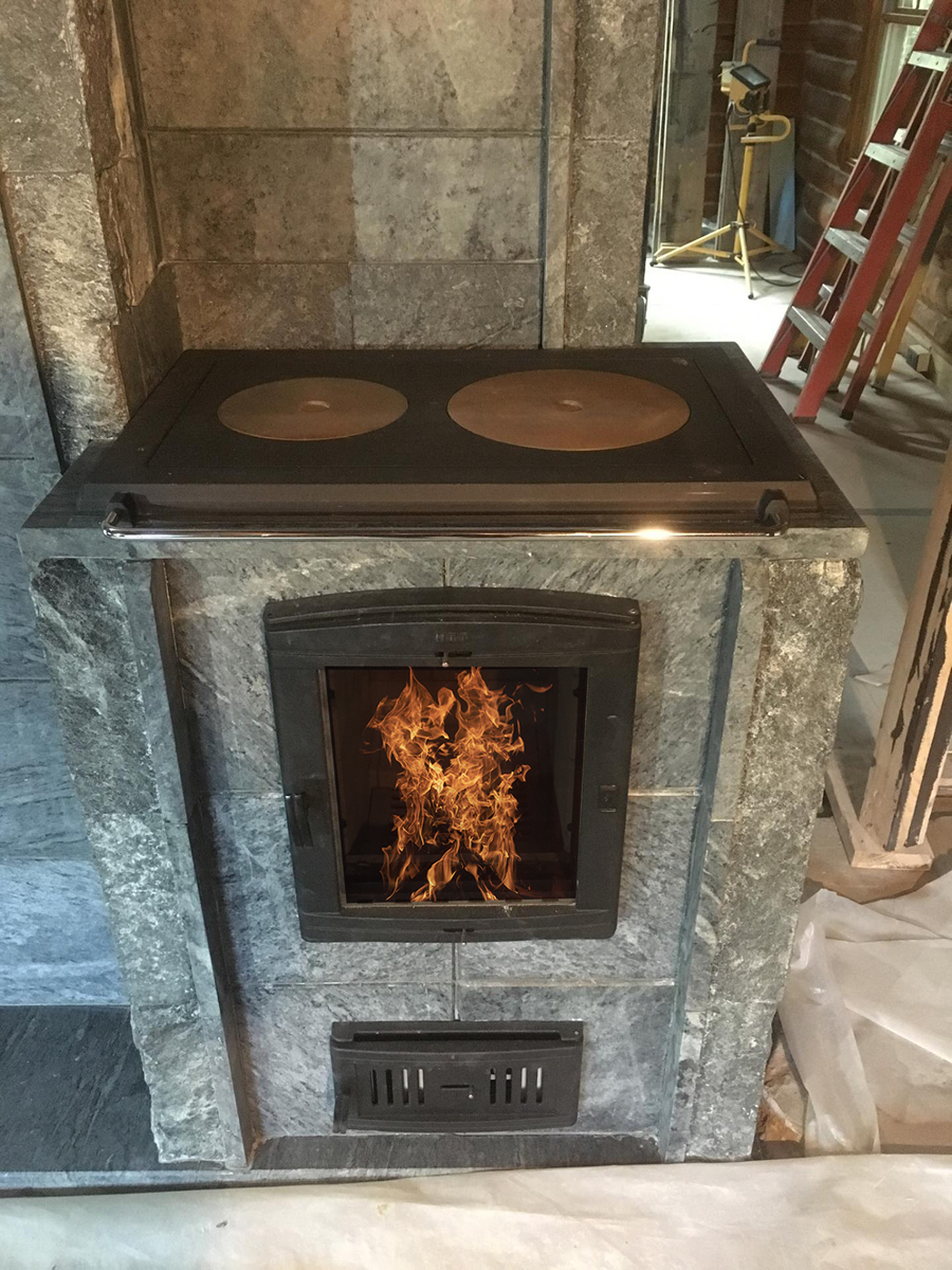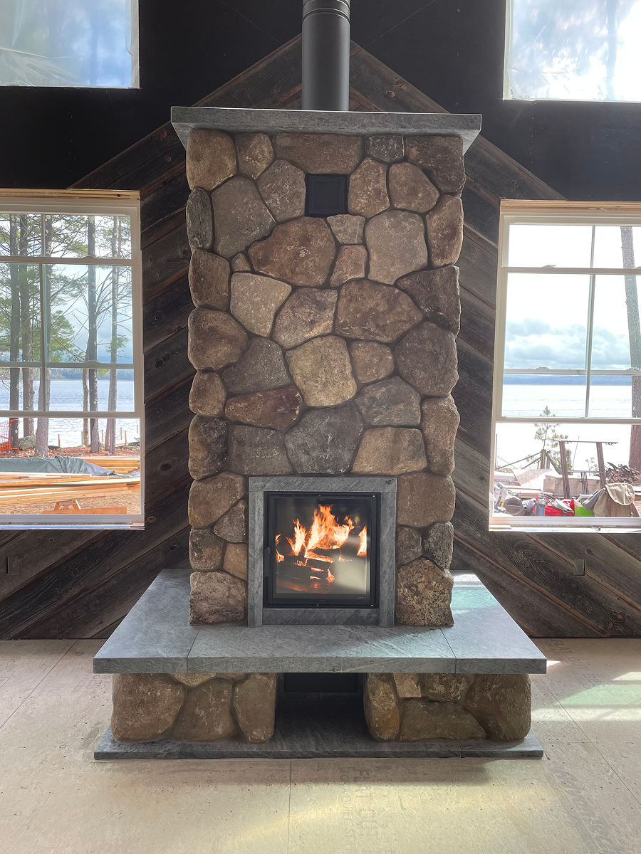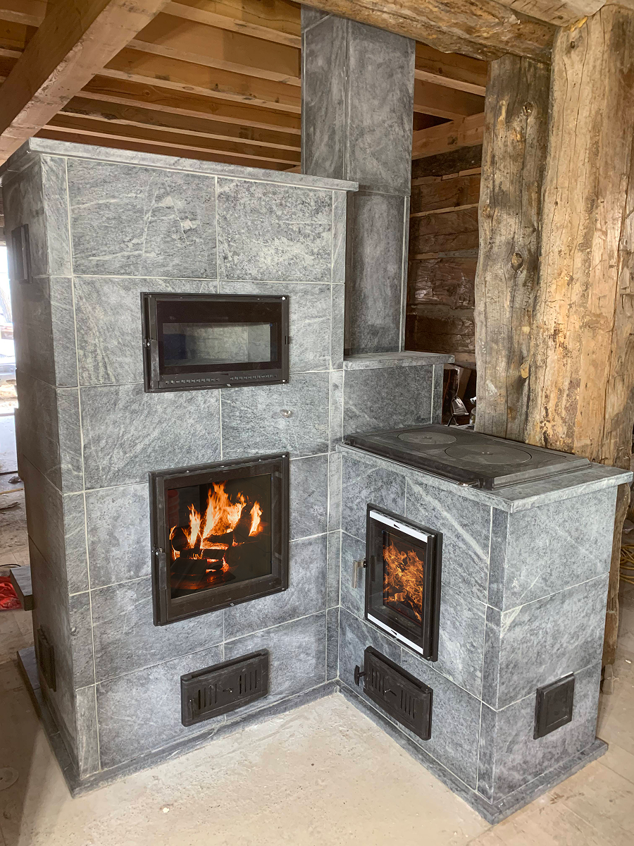 We offer complete custom design services, incorporating a wide variety of masonry heater traditions, shapes, sizes and materials. We often utilize our existing four firebox/core systems and customize the exterior shell shape to meet your specifications. Metal accent bands and split-faced soapstone corner details, allow for a customization and a one of a kind heater design. Horizontal orientations often lend themselves to Austrian single or double bell designs, while vertical configurations more commonly feature the Scandinavian tradition of five-run, J-loop or contraflow systems. Exterior materials can include soapstone, a wide variety of natural fieldstone, ledgestone or ashlar thin-veneer shapes, or any brick or stucco design available. We generally source veneer materials in your local area, when available.