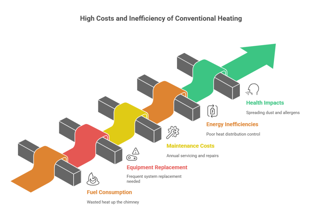 Traditional heating systems typically operate at only 20-30% real-world efficiency, meaning most of your fuel investment literally goes up in smoke.