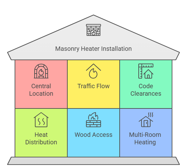 The ideal location provides access from multiple rooms, allowing the thermal mass to warm adjacent spaces effectively. Consider traffic patterns through your home and how a large masonry structure will affect room flow.