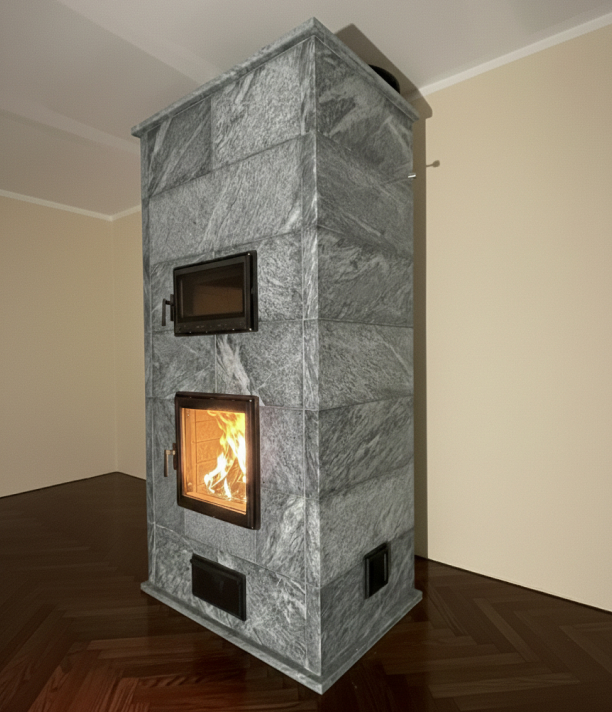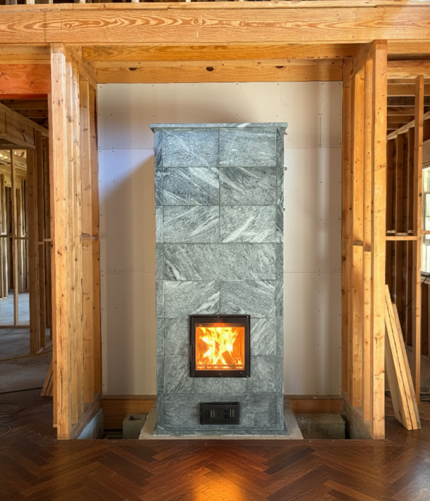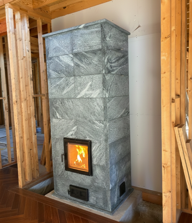 Eight course soapstone heater set into alcove