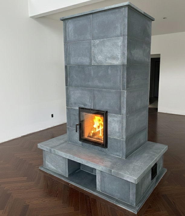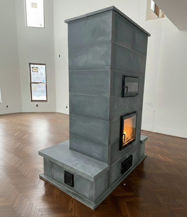 Soapstone tile flue pipe wrap and floor perimeter. Three-sided heated bench and front facing oven on Denver, Colorado heater.